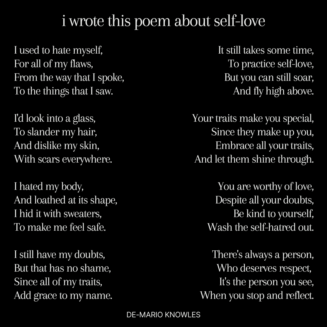 i wrote this poem about self-love is the sister poem to its predecessor, i wrote this poem about insecurities. With the previous poem being a vulnerable projection of my self-consciousness, I wanted to write a poem that encouraged my peers (and myself) to love the traits that make them who they are.