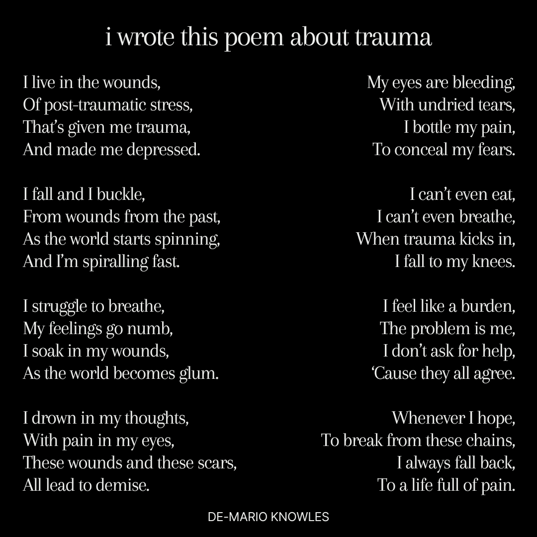 Unfortunately, experiencing trauma is something that many people around the world go through. Sometimes, people may be unable to talk about their traumatic experiences for various reasons. With this in mind, I wrote this poem to continue the conversation about mental health and promote more positive discussions in the mental health space.