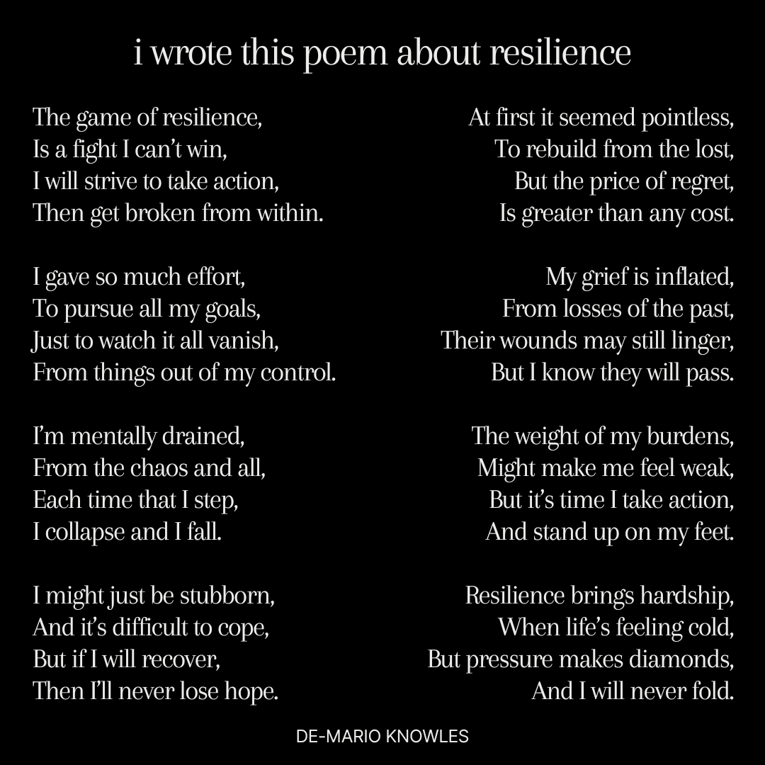 i wrote this poem about resilience was written during a challenging event that came into my life during the first half of 2025. I was on pace to headlining my first-ever speaking tour, and I was in the heart of my university’s midterm season. Unfortunately, my digestive system was weakened by significant inflammation and internal bleeding, and everything that I had planned had to be postponed due to health complications.